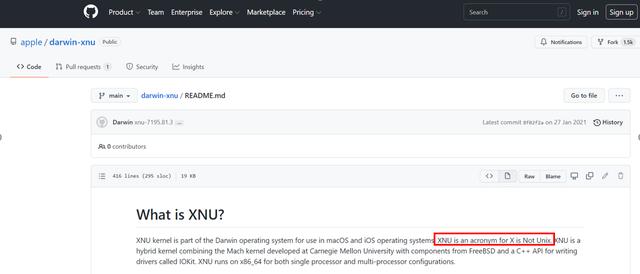 苹果公司是混合内核 采用XNU、Darwin的混合内核模式, XNU是将卡耐基梅隆大学Mach内核和FreeBSD组件整合成新的混合内核。驱动程序用C++ API实现,BSD子系统负责在微内核中实现为用户空间的服务,Mach负责底层调度。XNU的意思是“XNU is Not Unix”,看到字面意思,你就知道它和Unix的关系了,不要怀疑自己的眼睛,你没看错,我也没跟你开玩笑,“XNU is Not Unix”这句话不是我说的。苹果在Github上开源了XNU内核,内核简介我截图给你们看一下,免得以为我说瞎话