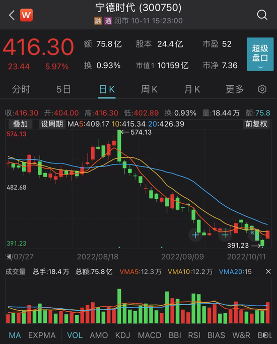10月11日,宁德时代收盘报416.3元/股,上涨5.97%。