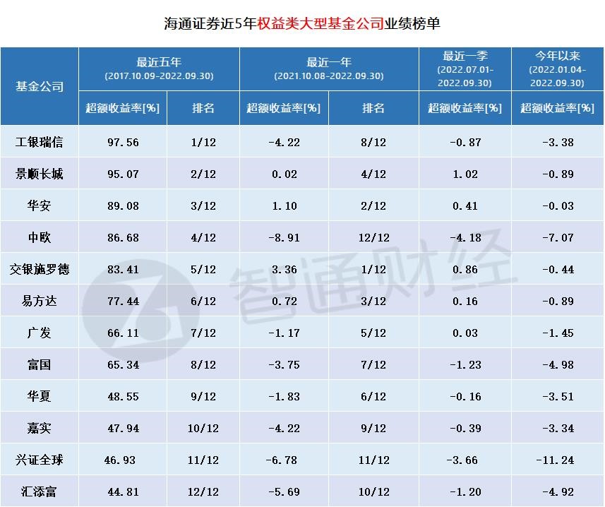 近日,海通证券发布基金公司权益及固定收益类资产超额收益排行榜,就近五年(2017年10月9日至2022年9月30日)权益类超额收益率来看,包揽前三名的基金公司分别是信达澳亚、华泰保兴、工银瑞信,收益率分别为121.97%、106.65%、97.56%,其中,前两名均属权益类小型公司。