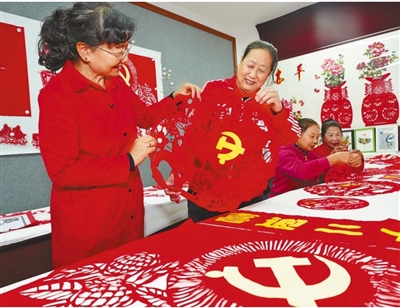 北京市丰台区南苑街道南庭新苑南区社区居民以剪纸表达对党的二十大的期盼之情。 本报记者 贺 勇摄