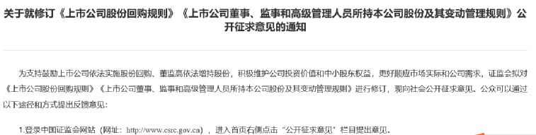 10月14日,证监会官网发布通知,为支持鼓励上市公司依法实施股份回购、董监高依法增持股份,积极维护公司投资价值和中小股东权益,更好顺应市场实际和公司需求,证监会拟对《上市公司股份回购规则》《上市公司董事、监事和高级管理人员所持本公司股份及其变动管理规则》进行修订,并向社会公开征求意见。
