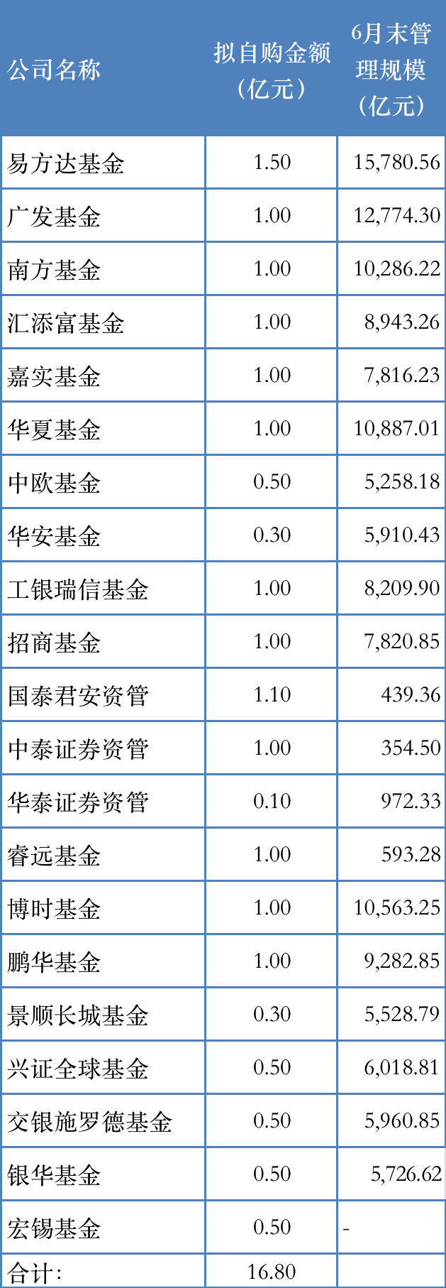 此前的10月17日,已有包括易方达基金、广发基金、南方基金、汇添富基金、嘉实基金、华夏基金、中欧基金、华安基金、工银瑞信基金、招商基金等在内的10家公募基金公司宣布自购。