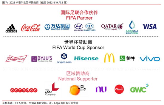 据中信证券整理,卡塔尔世界杯赞助商结构从高到低分为三类:国际足联合作伙伴(6-8席)、世界杯赞助商(6-8席)以及区域赞助商(五大区共20席)。