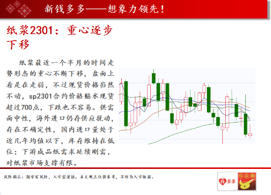 操作建议:纸浆最近一个半月的时间走势形态的重心不断下移,盘面上看是在走弱,不过现货价格岿然不动,sp2301合约价格贴水现货超过700点,下跌也不容易。